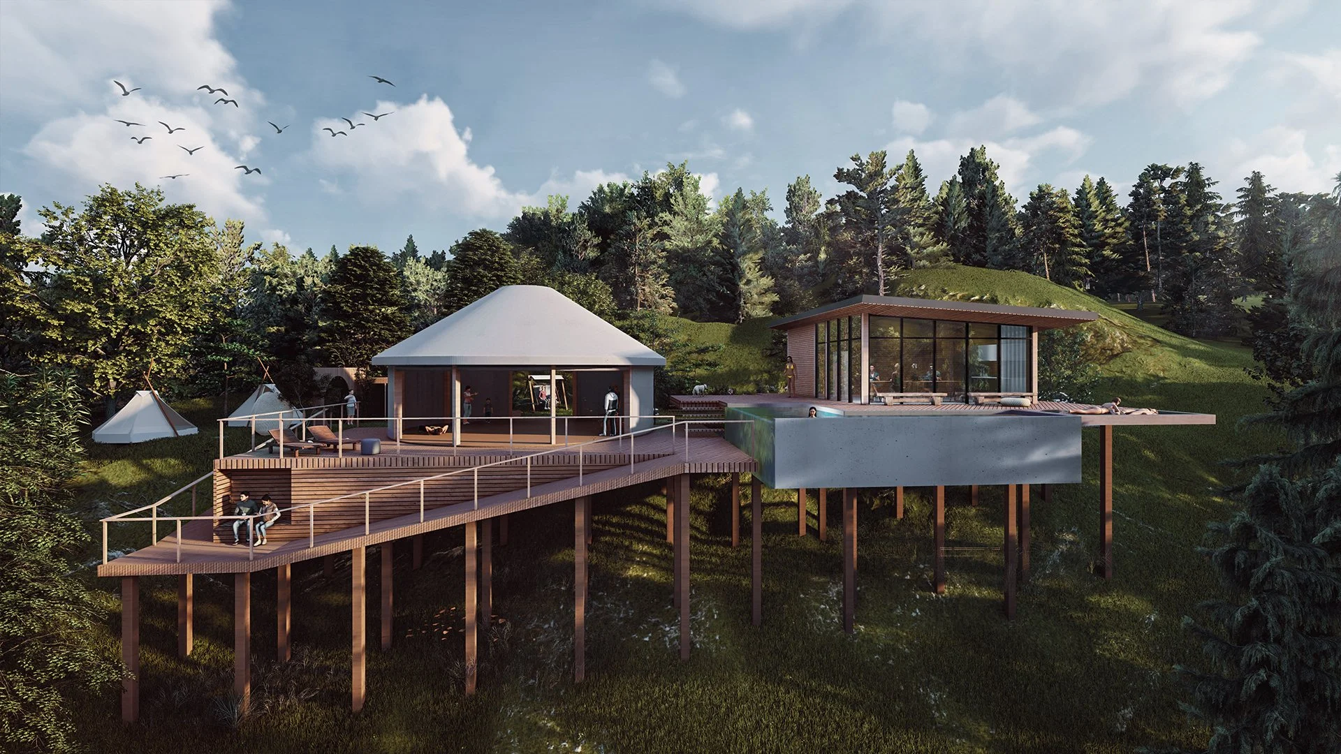 The meditation and yoga shala is a round, uninterrupted space which embraces continuity and both inward and outward projection. The hut protects from the sun and rain, while the adjustable vertical panels allow for expansive views of the valley. There are many hidden gems around the project that encourage unexpected interactions, as well as allow for private moments of reflection. In addition to the main hut, the project contains a suspended infinity pool, communal kitchen, zen garden, sauna and private meditation pods. All rainwater is stored, filtered and recycled and the kitchen roof contains solar panels, creating a completely off-the-grid development.
